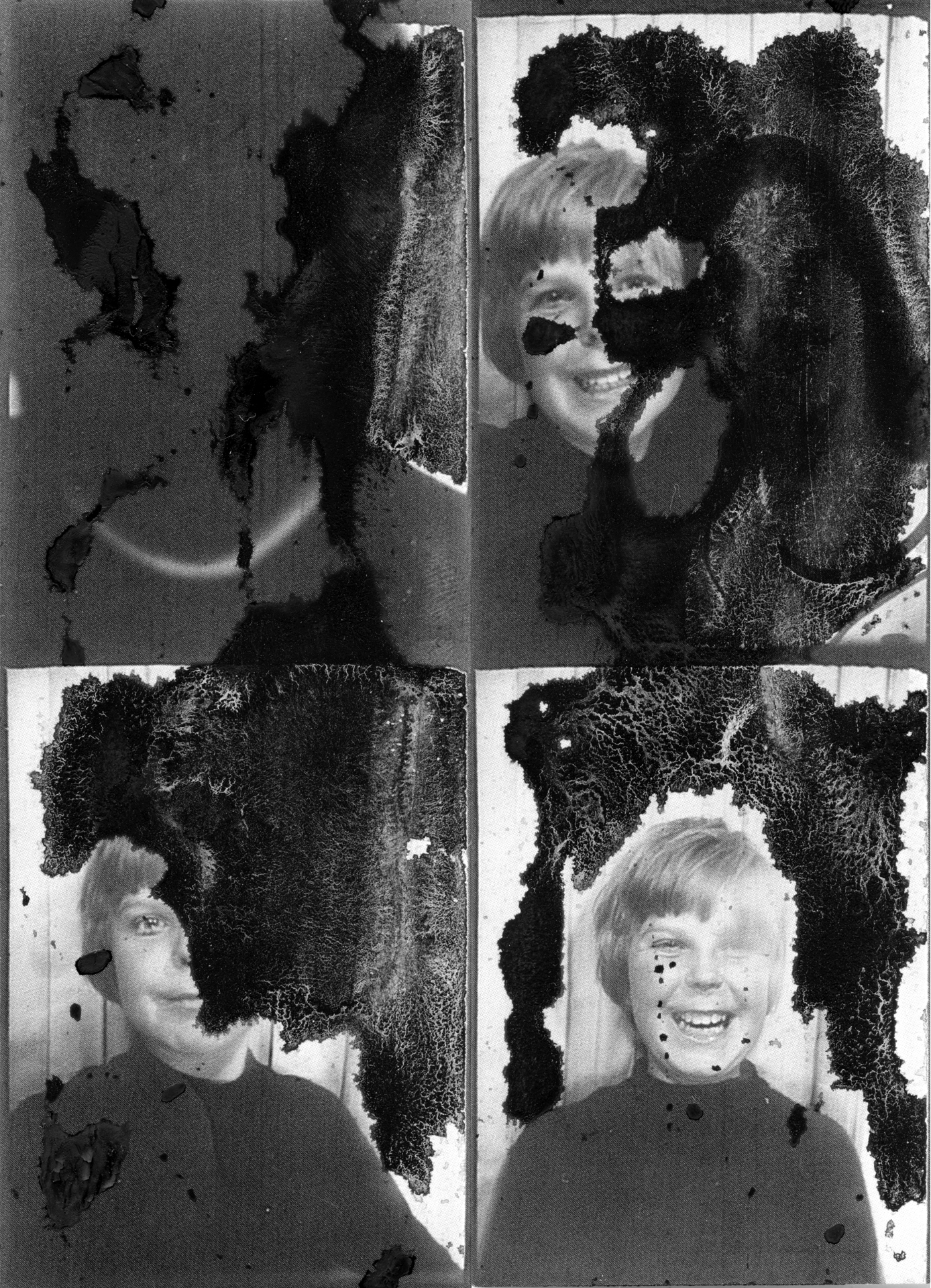 This work reconnects to the earliest and available form of selfies – the photobooth. These are a series of contemporised self-portraits, which investigate time, form, materiality, entropy and memory and the language of photography and preservation. The original photobooth images are self-portraits made in the 70’s and 80’s and accessed from my family snapshots and artist material archive.